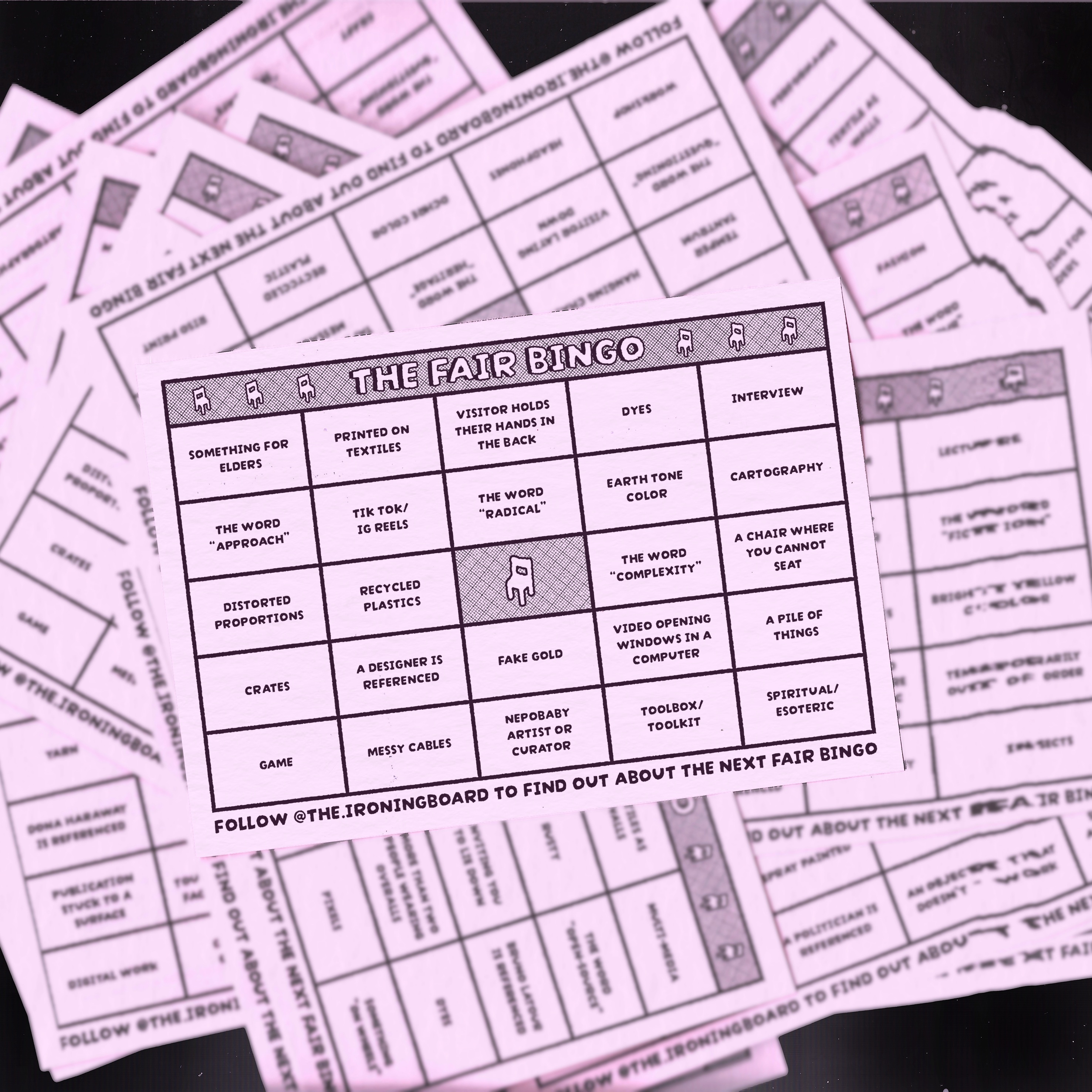 The Fair Bingo is a twist on the classic game that takes place in a design or art exhibition. Instead of numbers, the game cards contain exhibition tropes and conventions that the participants must find around the show in order to win.